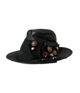 Dolce & Gabbana Black Leather DG Coin Crystal Wide Brim Hat