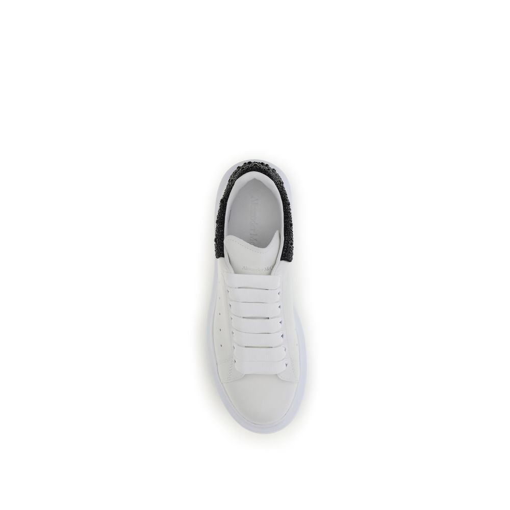 The Oversize Sneakers by McQueen feature an iconic silhouette in white calf leather, enhanced with a black heel adorned with crystals and accented by the McQueen signature. The thick rubber sole provides a bold, contemporary look, ideal for those seeking both style and comfort in one model.