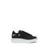 The Oversize Sneakers by Alexander McQueen feature an iconic silhouette in black calfskin with a white Skull print on the heel, featuring a round toe, McQueen signature, and a contrasting heel. The oversized rubber sole ensures comfort and bold style, making this model a symbol of contemporary design and bold personality.