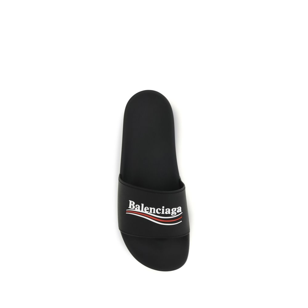 The rubber Slippers by Balenciaga are made entirely of rubber and feature an essential and contemporary slide design. The molded rubber insole ensures comfort and practicality, while the strap is embellished with the political campaign motif, an iconic and recognizable detail that gives the model a strong distinctive character and a bold aesthetic, perfect for completing casual and streetwear looks.