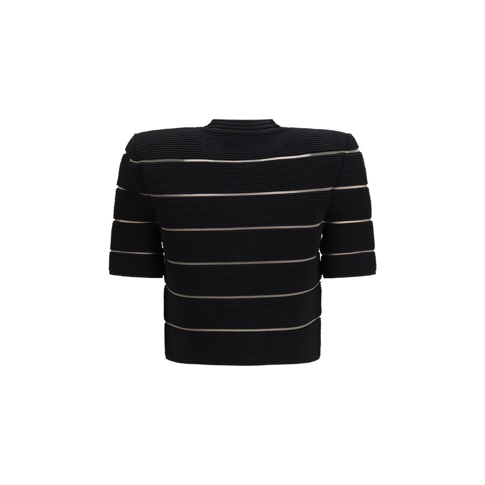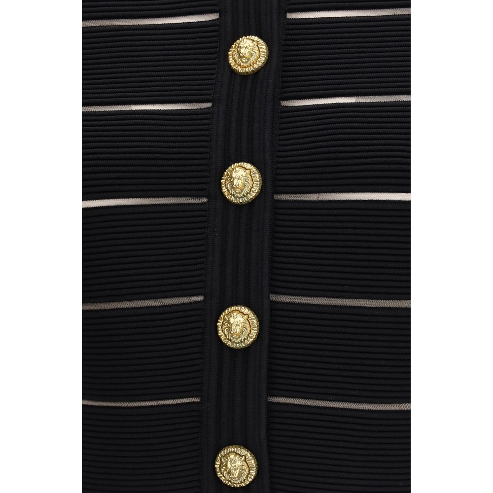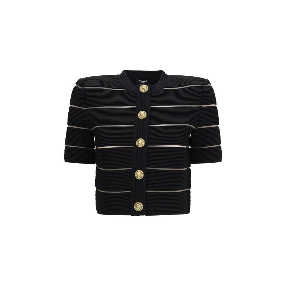 The short-sleeved buttoned Cardigan by Balmain is an elegant and contemporary Cardigan, featuring a horizontal stripe design that adds dynamism to the look. The model includes a round neckline, front button closure, and short sleeves for a practical and versatile fit. Perfect to wear with both casual and more refined outfits, it delivers a distinctive and sophisticated style.