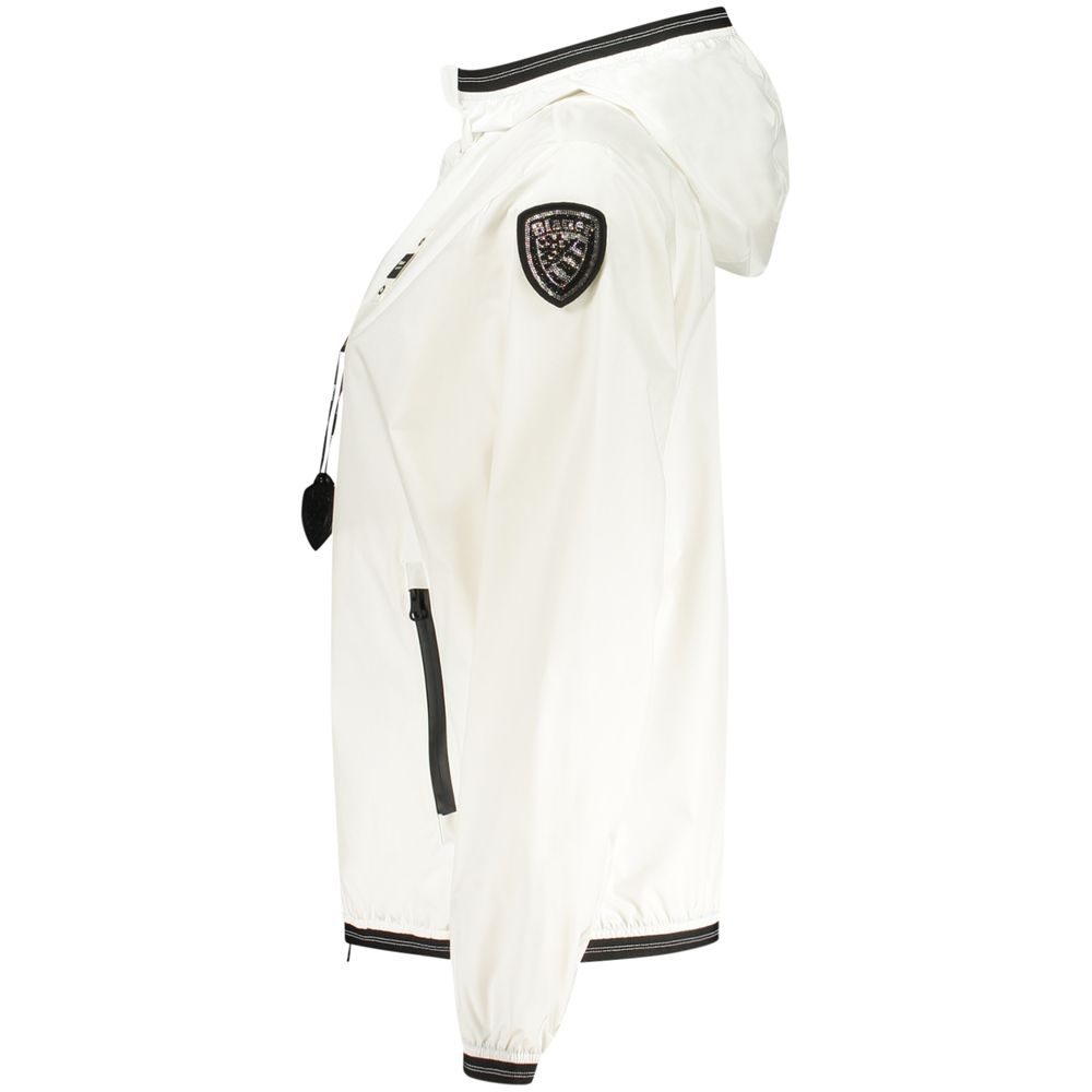 Dive into the epitome of sleek style with BLAUER’s long-sleeved waterproof jacket, perfect for fashion-forward individuals braving the elements. Tailored in a flattering slim fit, this pristine white jacket features a hood for added versatility. Practicality meets luxury with two external pockets, and an equal number of internal ones, ensuring your essentials stay dry and secure. The zip closure is smooth, while the removable rhinestone appliqué adds a touch of glamour. A subtle logo placement assures authenticity without overpowering the design’s sophistication.
