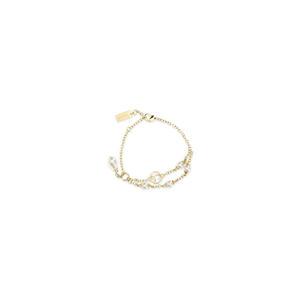 The Heirloom Bracelet by ChloĆ© is an elegant gold-tone brass accessory, featuring a double front chain, a cursive āCā medallion, and glass pearl inserts. A logo plaque in a gold finish completes the design with a refined touch.