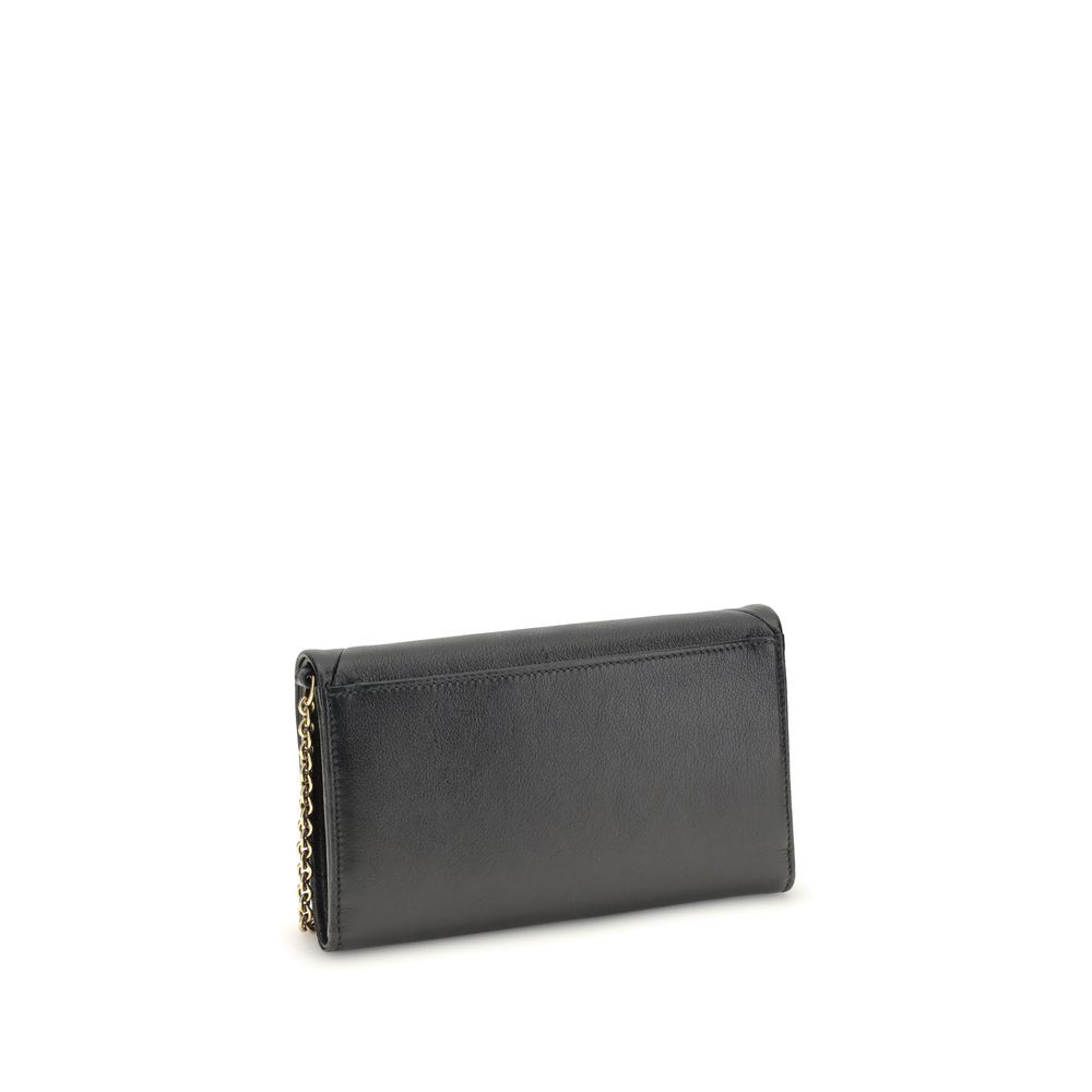 The Spin Wallet with Flap and Chain by ChloƩ is crafted from garnet buffalo leather with an interior of buffalo leather and a polyester-cotton blend fabric. Equipped with a chain shoulder strap, it can be worn crossbody or over the shoulder. Features include a flap with magnetic closure, two main compartments, one zippered compartment, six card slots, and a flat external pocket for functional organization and refined style.