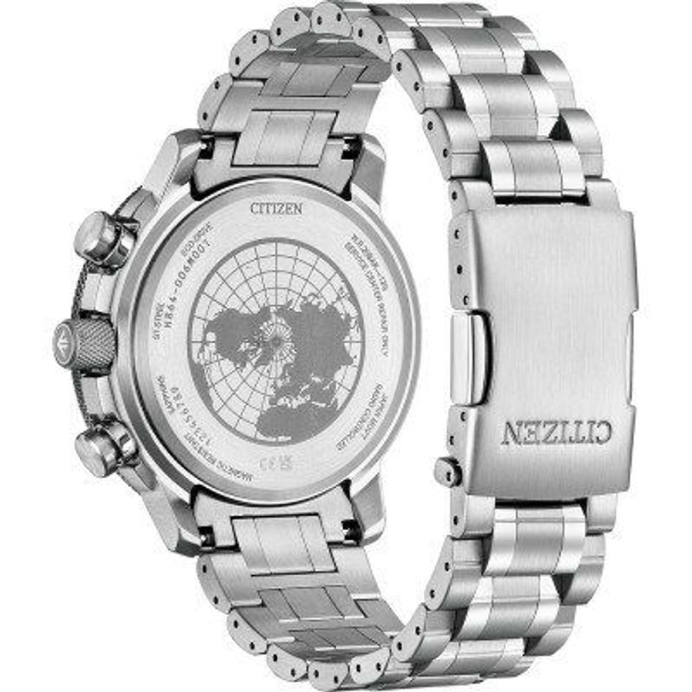 Special Functions:GEO TREKK MACHINERY ECO DRIVE RADIO CONTROLLER H864 WITH 6 MONTHS POWER RESERVE 20 MONTHS IN POWER SAVING MODE 24H UTC DATE AND DAY NORTHERN HEMISPHERE DISC TO DISPLAY VARIOUS TIME ZONES – POWER RESERVE INDICATOR – TIME SIGNAL RECEPTION FROM ATOMIC WATCHS: MANUAL, AUTOMATIC AND IN “AUTOMATIC RECOVERY” MODE COMPATIBLE WITH ATOMIC WATCHS OF JAPAN, CHINA, USA AND GERMANY – WORLDTIMER 26 ZONES – SUMMER TIME: AUTOMATIC OR MANUAL PROGRAMMING – CALENDAR PERPETUAL UNTIL 28.