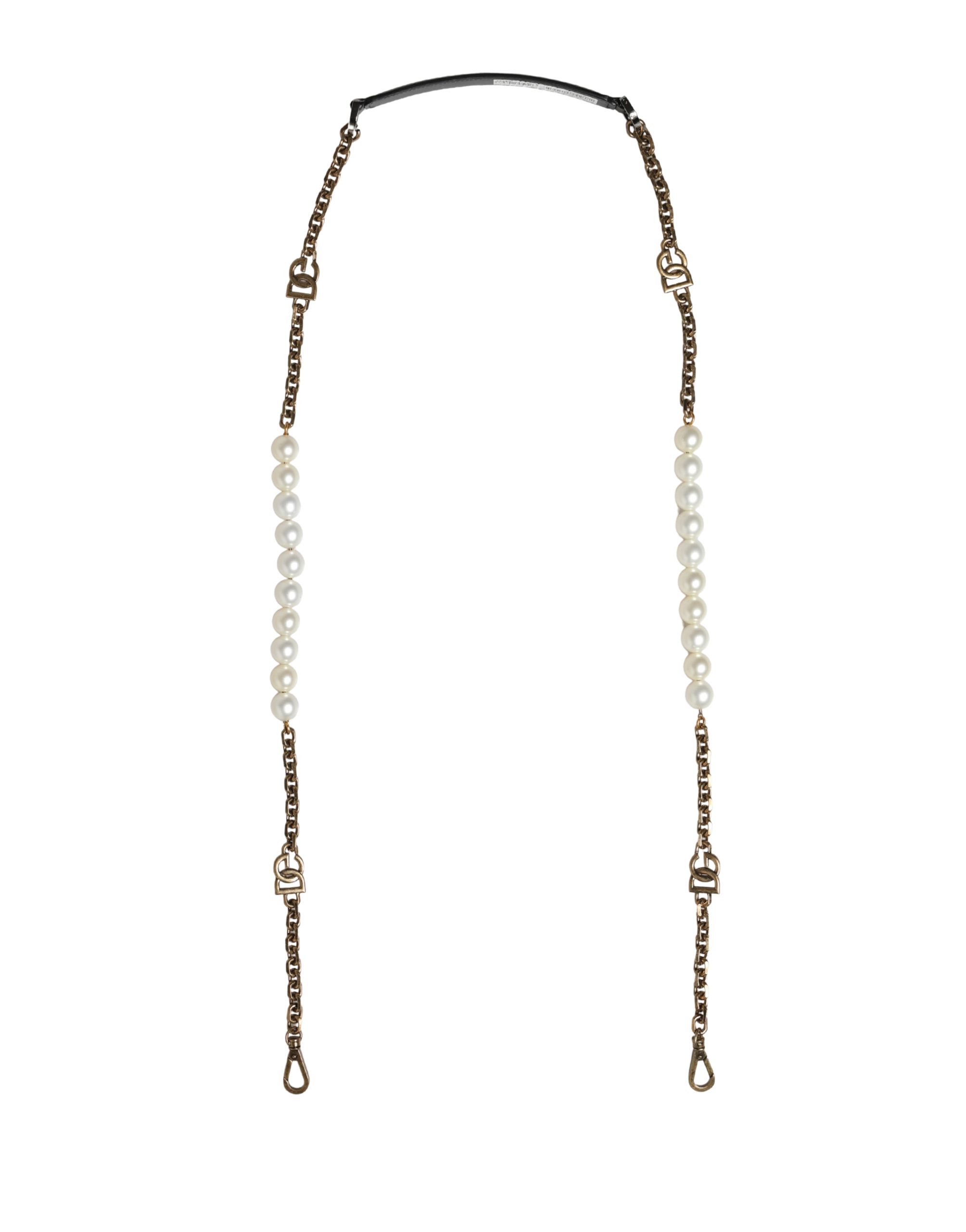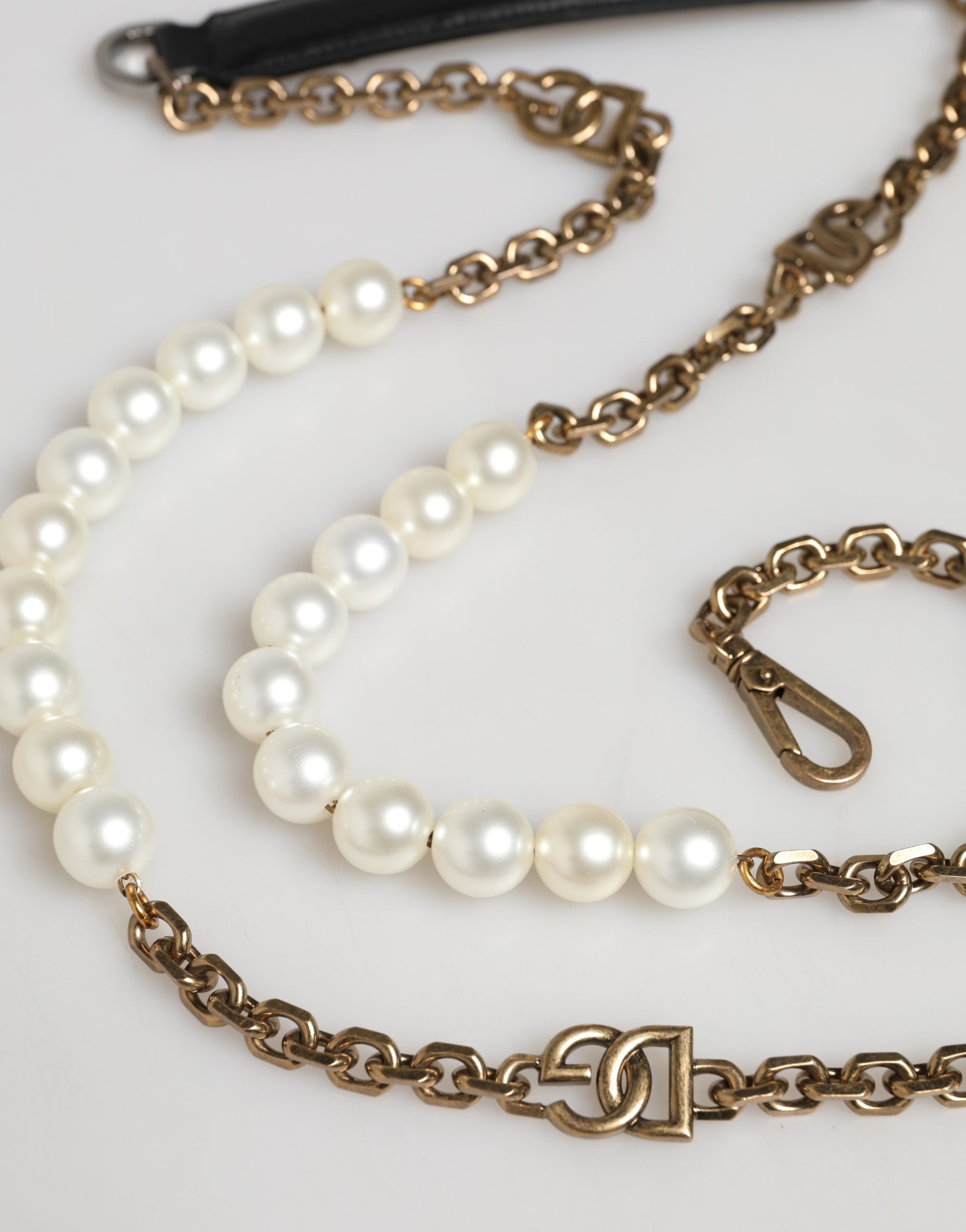Gorgeous brand new, 100% Authentic Dolce & Gabbana shoulder strap. Crafted in Italy, this piece combines black leather, gold-tone chain links, and oversized pearl accents, complete with the iconic DG logo charm. A luxurious accessory to elevate any bag.