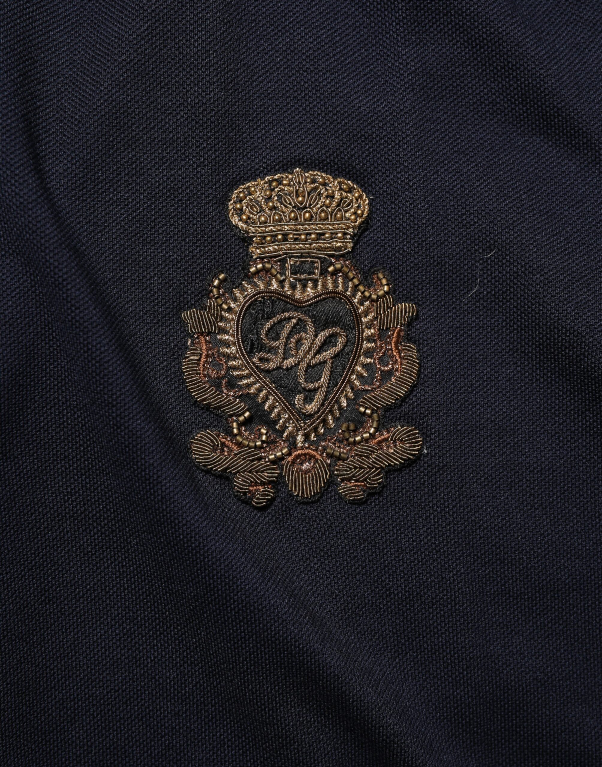 Gorgeous brand new, 100% Authentic Dolce & Gabbana men’s t-shirt.This stylish navy blue polo features a ribbed collar with grey tipping, short sleeves with striped trim, and a signature gold embroidered DG crest logo on the chest. A timeless piece that combines elegance with everyday comfort.