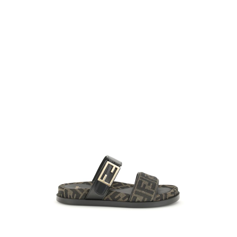 The FF fabric Sandal by Fendi is a flat slide featuring a double strap with a decorative FF Baguette buckle. Crafted in jacquard fabric with the iconic FF pattern and black nappa leather details, it is finished with gold-tone metal hardware.