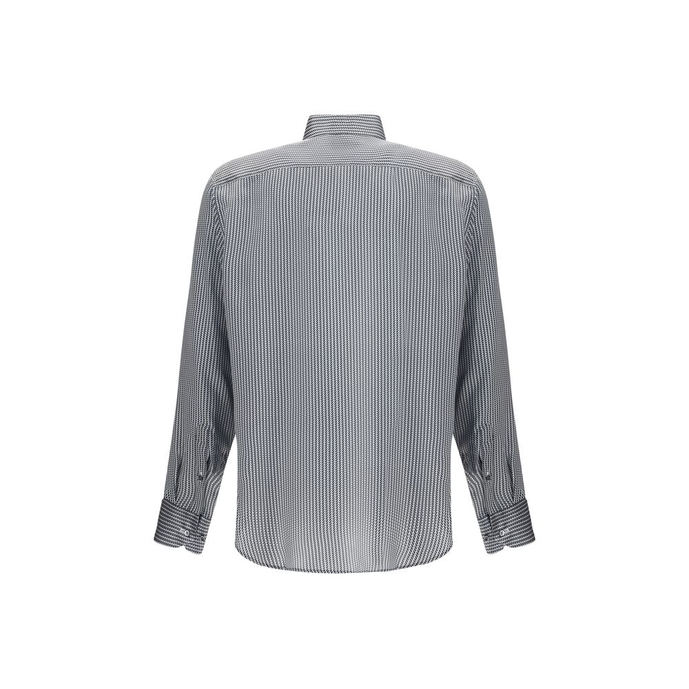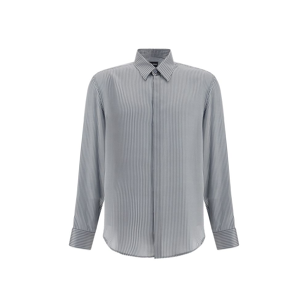 Giorgio Armani’s silk satin Shirt is embellished with a sophisticated geometric pattern. It features an Italian collar with slats, a hidden mother-of-pearl button closure under mock, buttoned cuffs and a back yoke for a flowing, refined elegance.