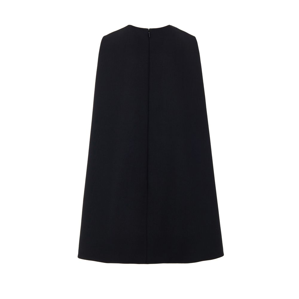 In black wool, two side welt pockets, hidden zip opening at the back. 60s-inspired model with round neckline and fabric pleat stitching on the sides. Tone-on-tone logo embroidery on the bottom.