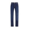 The Nick Ltd Slim Fit 5-Pocket Jeans by Jacob Cohën showcase Italian craftsmanship in an exclusive edition. Featuring a pony hair and Saffiano leather patch, a rose-gold finished Limited Edition metal plaque, and a unique serial number, these jeans embody sophistication and individuality. Details like the flat engraved button, embroidered fly, and the signature printed bandana highlight the brand’s dedication to luxury and authenticity.