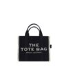 Cotton The Medium Tote Handbag by Marc Jacobs, two rigid tubular top handles, top zipper closure, single interior pocket, adjustable and removable flat shoulder strap, contrasting jacquard print iconic brand monogram on front, contrasting patch with iconic brand monogram applied on back.
