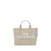 The cotton Medium Tote Handbag by Marc Jacobs, two rigid tubular top handles, top zipper closure, single interior pocket, adjustable and removable flat shoulder strap, contrasting iconic brand monogram print on front, contrasting iconic brand monogram patch applied on back.