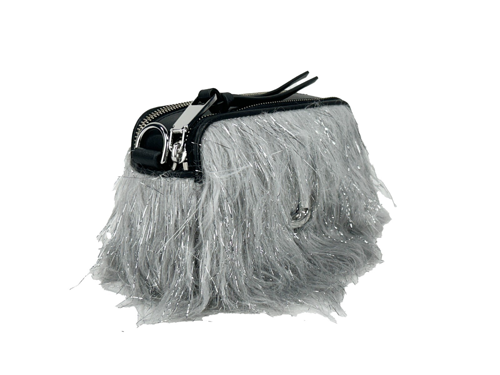 With an adjustable and detachable web crossbody strap in sophisticated black, this bag transitions effortlessly from casual outings to elegant soirées. It includes inner zip and slip pockets, providing ample storage for your essentials while keeping them organized. The zip closure ensures your belongings remain secure, while the striking silver exterior adds a touch of high-fashion allure.