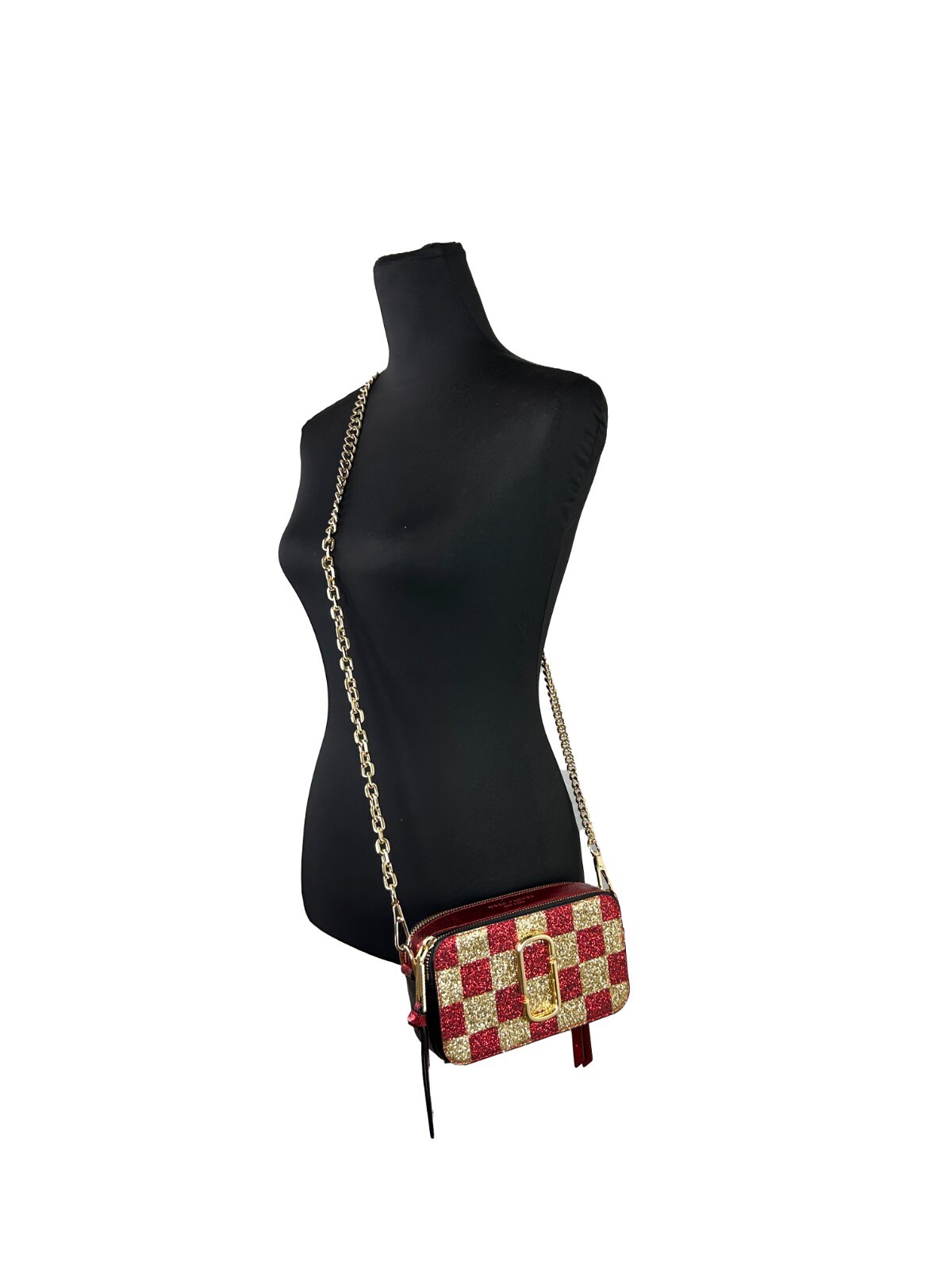 Introducing the Marc Jacobs The Snapshot Crossbody Bag, a perfect blend of style and functionality for the discerning woman. This elegant bag, crafted from high-quality leather with a glitter finish, features a captivating New Gold Multi color that elevates any outfit, making it a versatile accessory for various occasions—whether it be a business meeting, a casual outing, a glamorous party, or a sophisticated wedding.