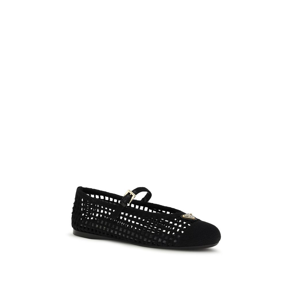 The crochet Ballerinas by Prada combine handcrafted elegance with distinctive details. The upper, embellished with logo-embossed metal buckle, is complemented by the enameled metal triangle logo, the brand’s iconic symbol. The 0.5-mm one-piece rubber sole with branded logo ensures comfort and a touch of refined style.