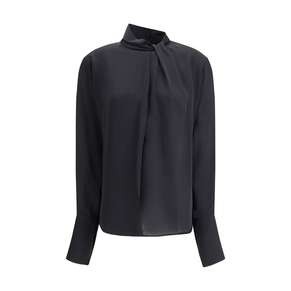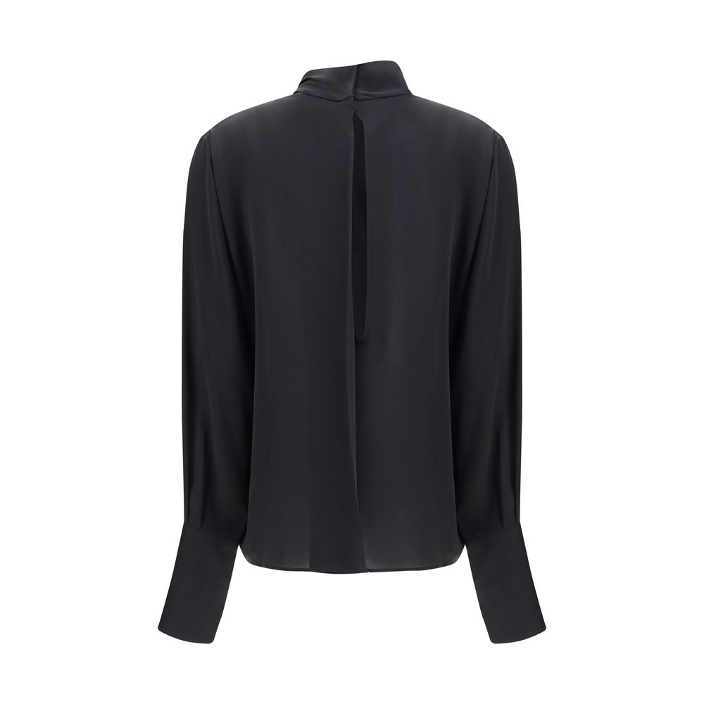 Tom Ford’s silk georgette Blouse is an elegant and sensual piece perfect for special occasions. Featuring a refined high neck, it is distinguished by cut-out details on the front and back, which add a bold and sophisticated touch to the design. The back closure with snap buttons completes the garment discreetly, enhancing the slender and feminine silhouette. An iconic model that combines light transparencies and tailored details, typical of Tom Ford’s decisive aesthetic.