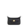The Leather Hobo Handbag by Versace, flat handle that can be opened on one side, adjustable and removable flat shoulder strap, three-dimensional iconic brand monogram plaque applied to front, zipper closure at top, metal feet at base of bag, single interior compartment.