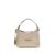 The Leather Hobo Handbag by Versace, flat handle that can be opened on one side, adjustable and removable flat shoulder strap, three-dimensional iconic brand monogram plaque applied to front, zipper closure at top, metal feet at base of bag, single interior compartment.