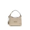 The Leather Hobo Handbag by Versace, flat handle that can be opened on one side, adjustable and removable flat shoulder strap, three-dimensional iconic brand monogram plaque applied to front, zipper closure at top, metal feet at base of bag, single interior compartment.