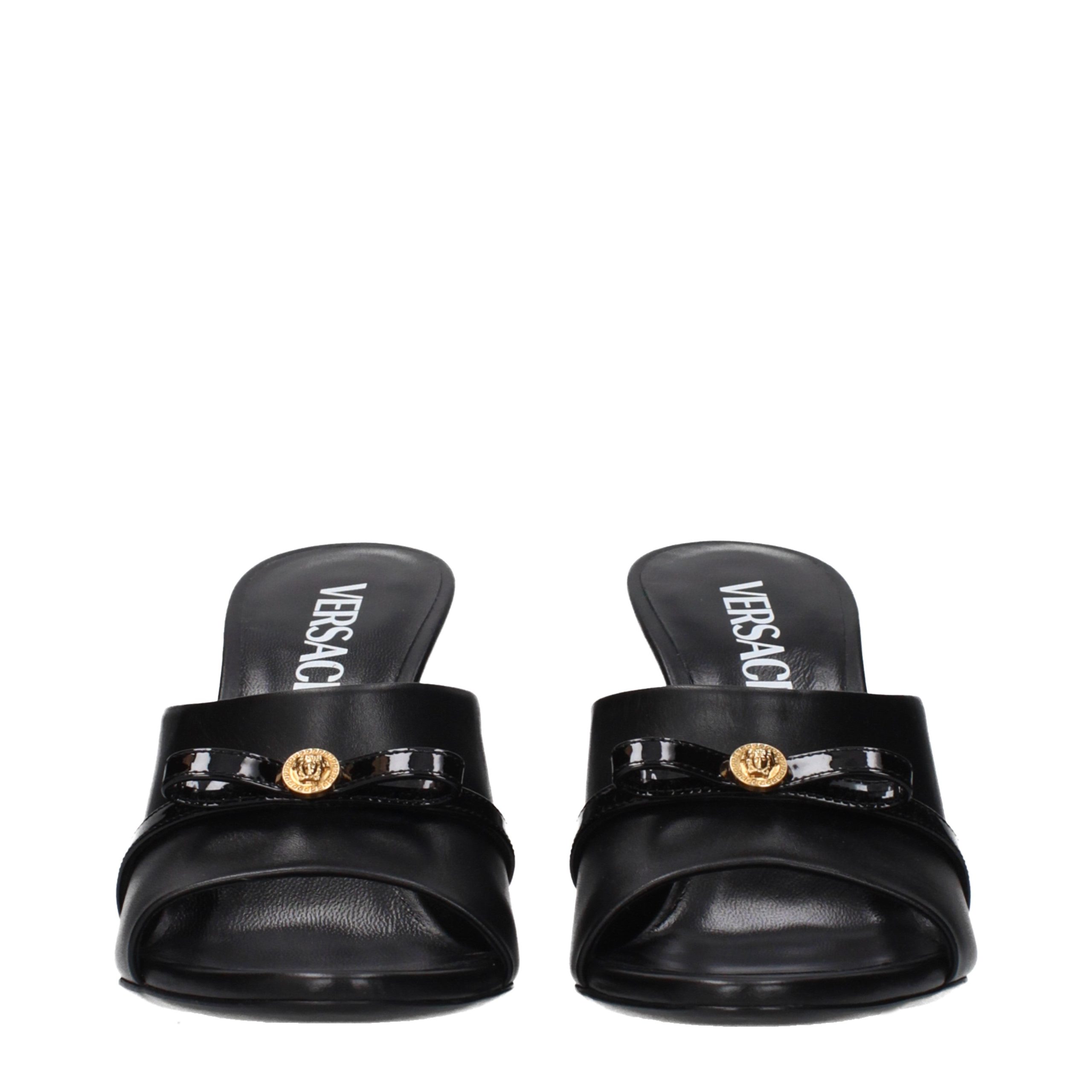 The product with MPN 10161961A023101B00V and code F86644 leather in black is a wedges designed by Versace. It has features like front detail.