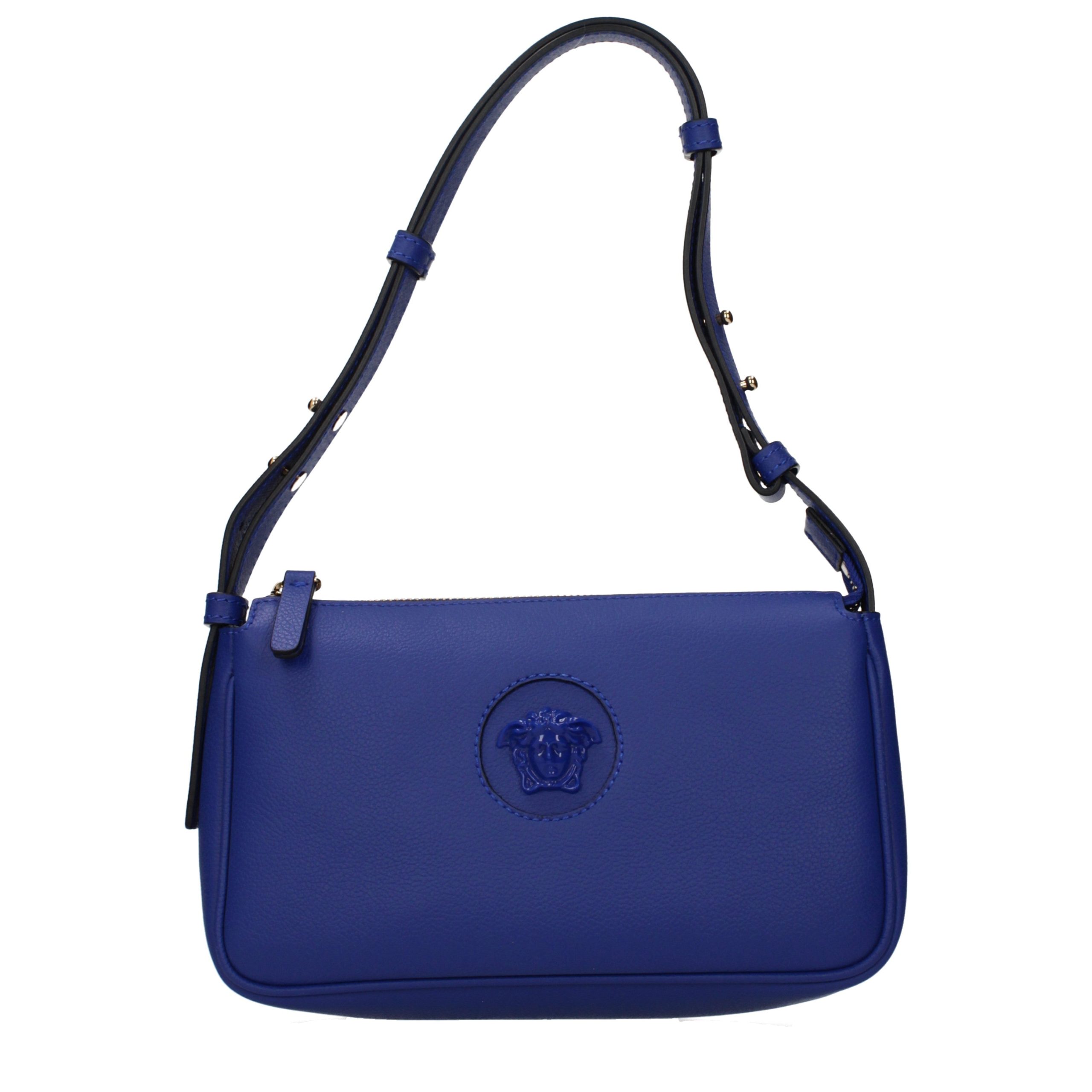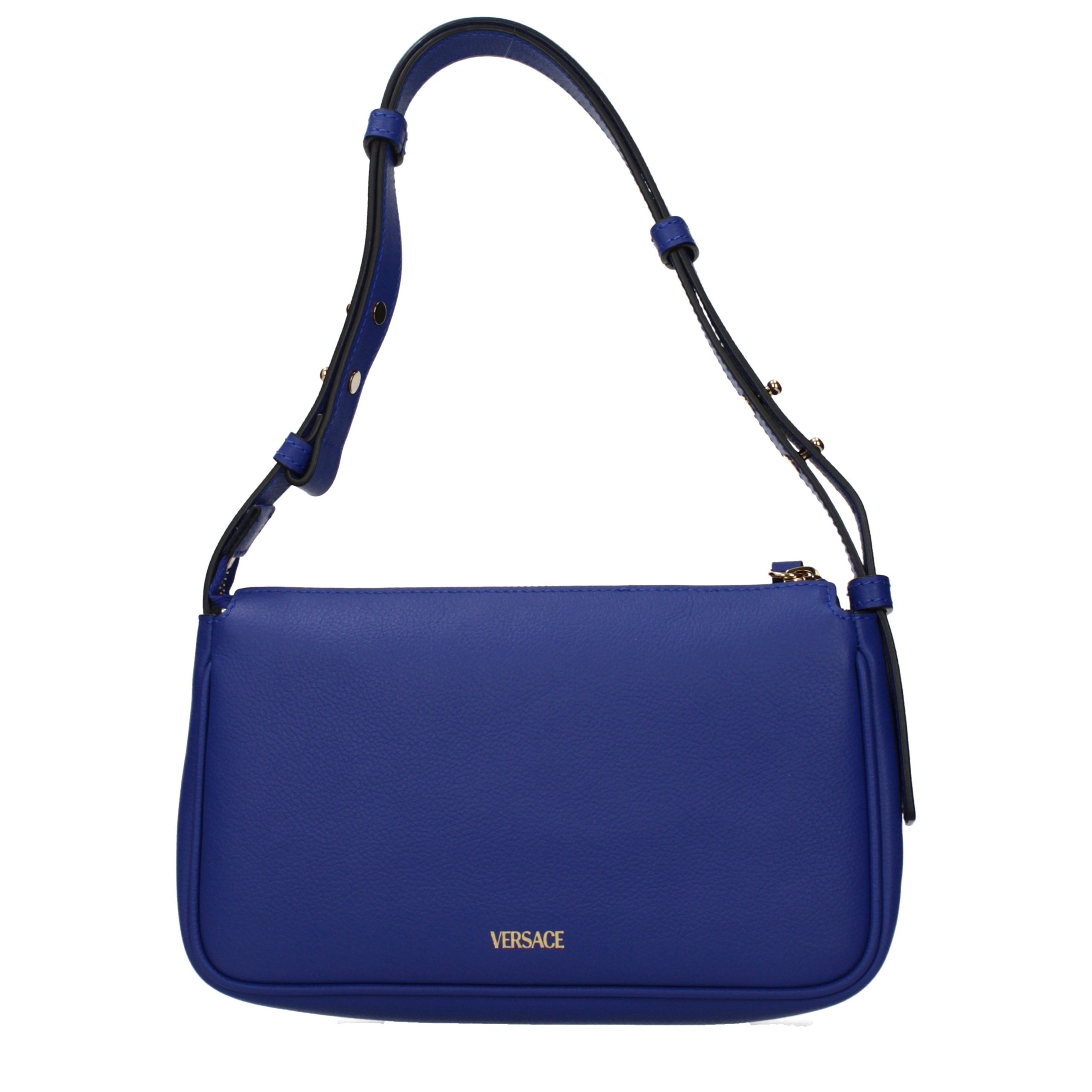 The product with MPN 1014245DVIT2T1U69V and code F80309 leather in blue is a shoulder bags designed by Versace. It has features like front detail, adjustable handle, back logo.